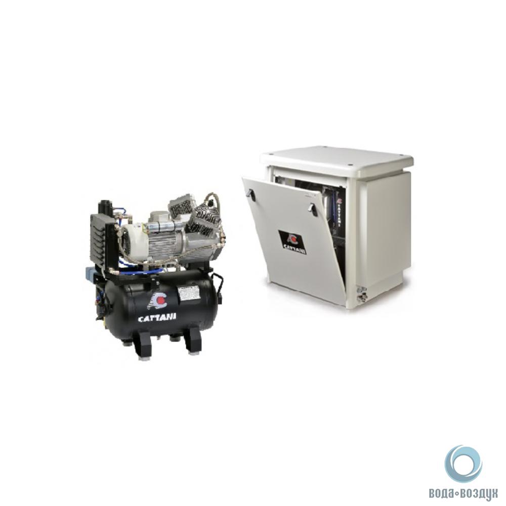 Компрессор стоматологический CATTANI на 2 установки в металлическом шумозащитном кожухе -двухцилиндровым, безмасляный, оборудованный осушителем, системой фильтров и охлаждения, обеспечивает подачу сухого сжатого воздуха наивысшего качества и чистоты на рабочее место врача.