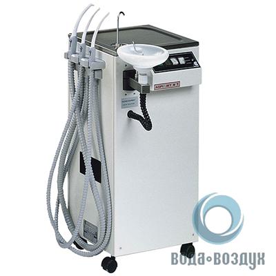 Полностью независимый агрегат, стальной столик, 3 терминала слюноотсос/пылесос, встроенная плевательница, автоматическое наполнение стакана, канистра 4 л для сбора аспирата (опустошается автоматически).
