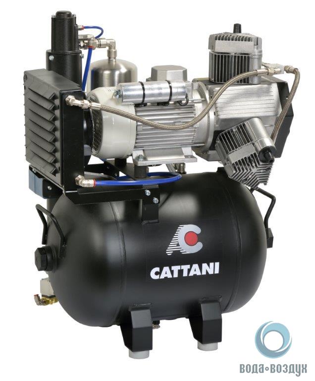 Компрессор стоматологический CATTANI на 3-4 установки - трехцилиндровый, безмасляный, оборудованный системой фильтров и охлаждения, обеспечивает подачу сжатого воздуха высокого качества и чистоты.